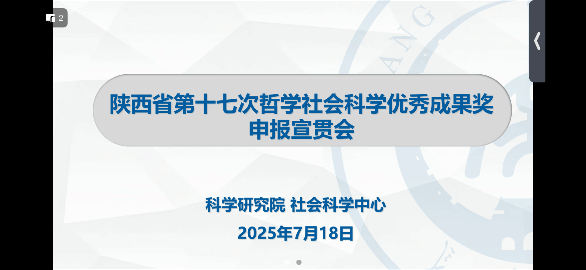 为进一步做好“陕西省第十七次哲学社会科学优秀成果奖”申报的全方位精准服务,切实提高申报质量,学校于7月18日下午召开陕西省第十七次哲学社会科学优秀成果奖申报宣贯线上会议。会议由科研院副院长赵敬源主持。